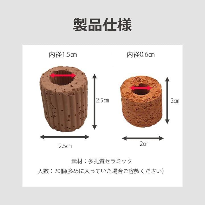 「製品仕様」素材:多孔質セラミック 入数:20個 内径1.5cm仕様の寸法:外径2.5cm* 内径1.5cmx 高さ2.5cm 内径0.6cm仕様の寸法:外径2cm* 内径0.6cmx 高さ2cm