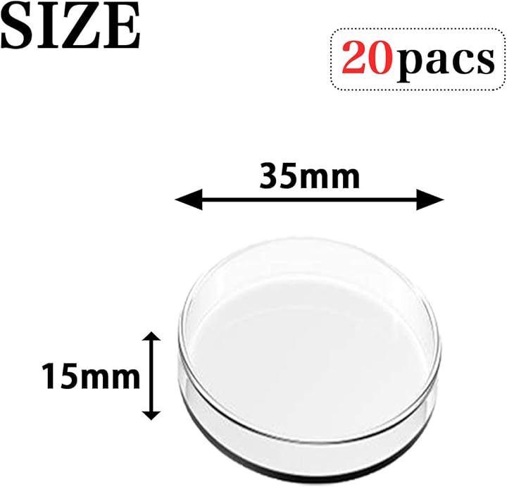 「商品内容」蓋付きシャーレ:20個入 サイズ:直径35mm、高さ15mm 重量:5.3g / 個 カラー:クリア 素材:プラスチック