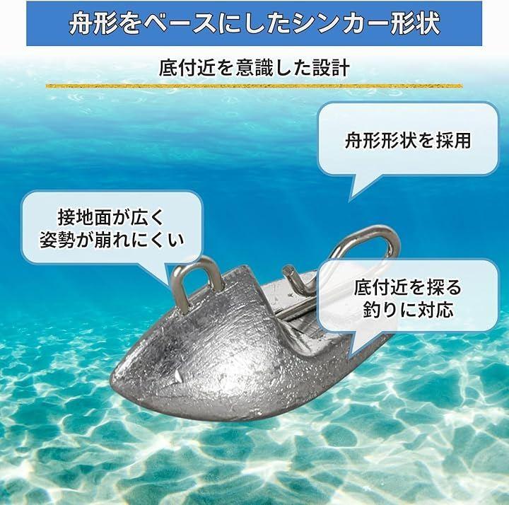 「舟形をベースにした安定しやすい形状」シンカー本体は舟形をベースにした形状を採用しており、水中での姿勢が安定しやすい構成です。