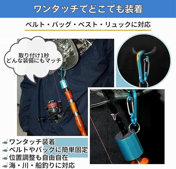 「両手を自由に使える便利なロッドホルダー」釣り竿をしっかり固定し、両手を自由に使えるカラビナ付きロッドホルダーです。