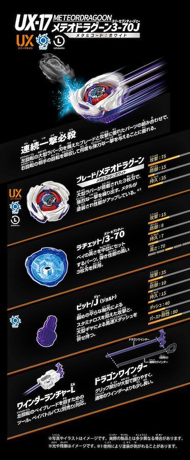 [UX-17] ブレードのメタルを外周に多く配分し、固有の性能に特化したユニークラインの左回転ベイ。左回転大型ラバー刃を備えたブレードと攻撃に優れたパーツの組み合わせで、右回転の相手の回転を吸収して何度も強力な一撃を与えることに優れたベイ。JAN: 4904810997627パッケージサイズ: W130×H152×D65mm対象年齢:6歳~