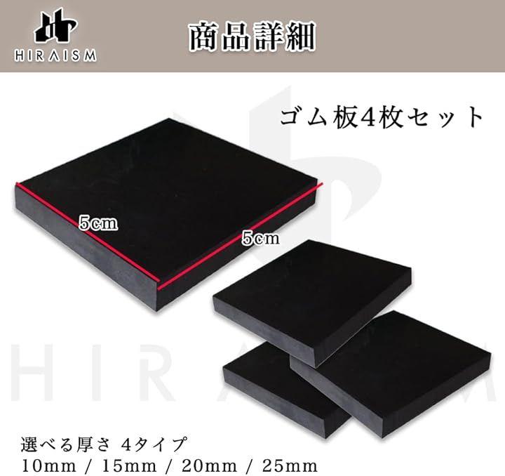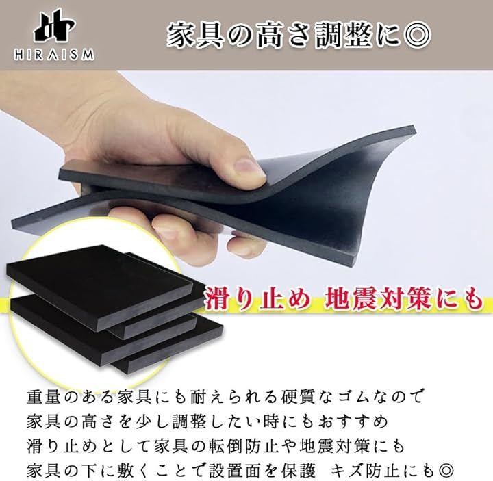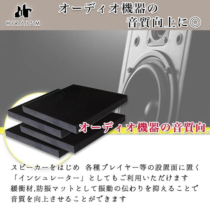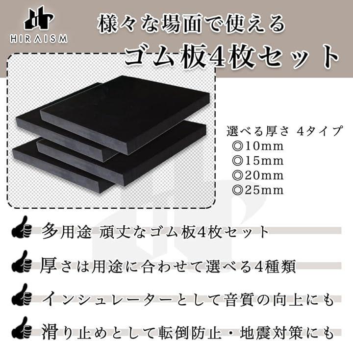 「多用途で頑丈なゴム板4個セット」防振マット、滑り止め、ブロッククッション、家具の高さ調整及び転倒防止、床やフローリングの保護、音響機器のインシュレーター等、様々な用途で活躍するHIRAISMのゴム板4枚セットです。