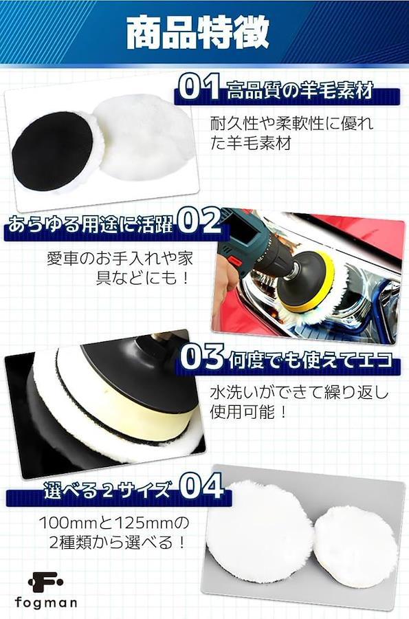 「商品特徴」(1)高品質の羊毛素材:耐久性や柔軟性に優れた羊毛素材/(2)あらゆる用途に活躍:愛車のお手入れや家具などにも。/(3)何度でも使えてエコ:水洗いができて繰り返し使用可能。/(4)選べる2サイズ:100mmと125mmの2種類から選べる。