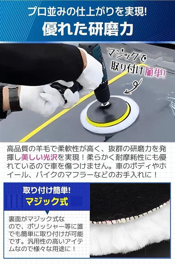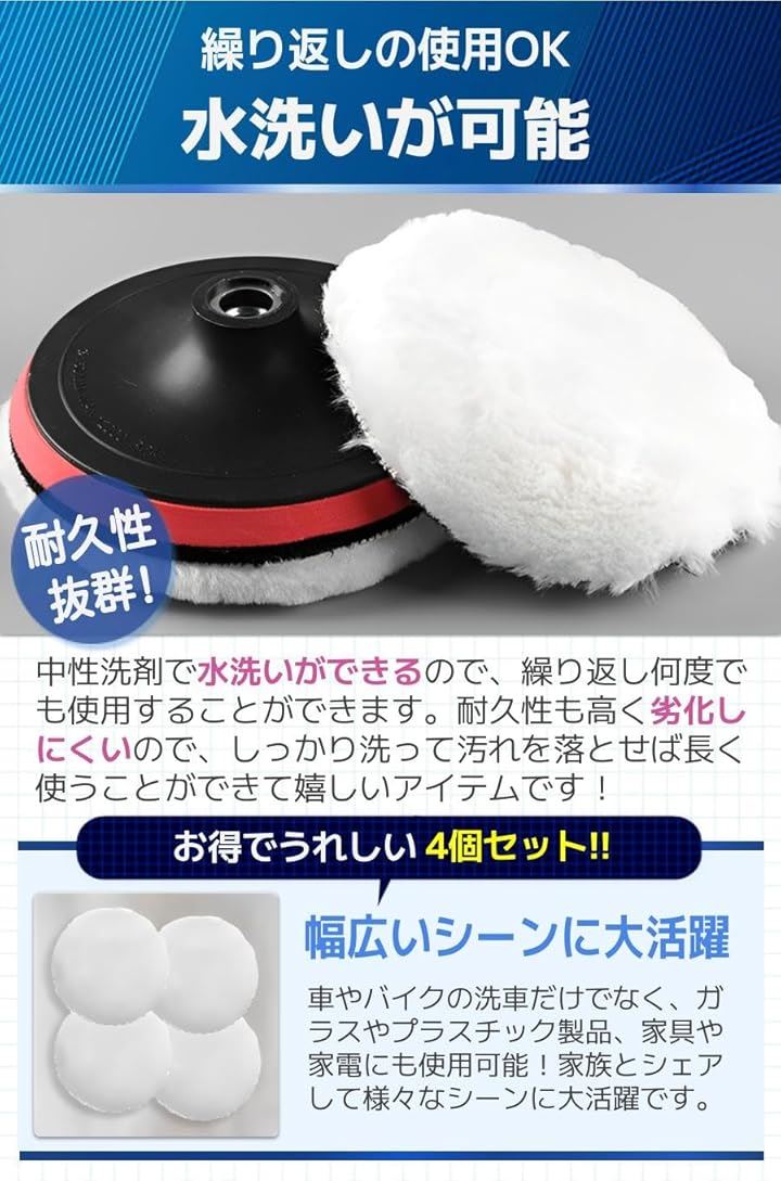 「優れた研磨力」高品質の羊毛で柔軟性が高く、抜群の研磨力を発揮し美しい光沢を実現。柔らかく耐摩耗性にも優れているので車を傷つけません。