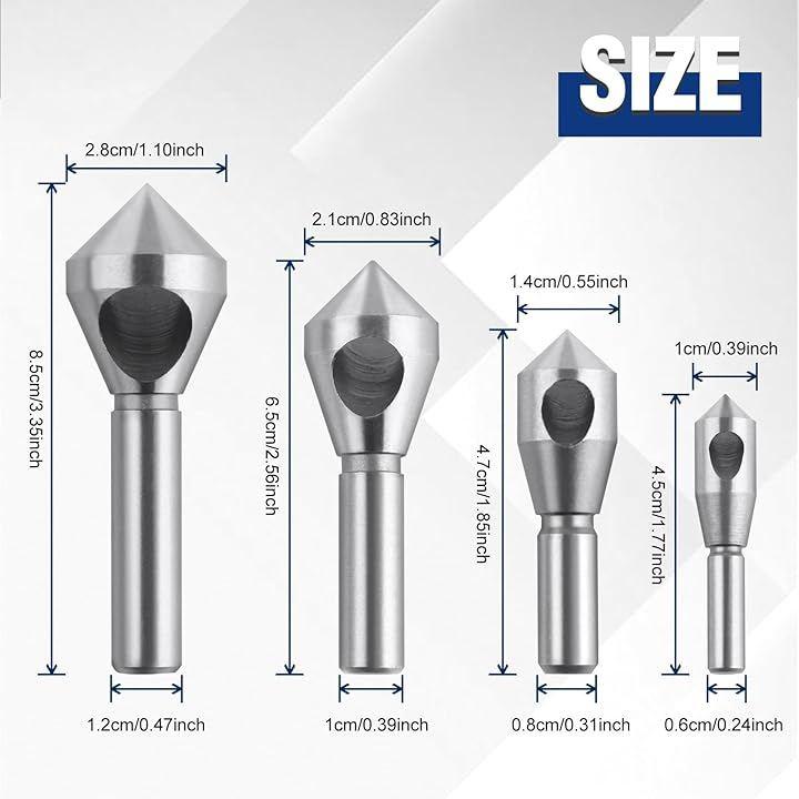 「サイズ」面取り範囲:2-5mm、5-10mm、10-15mm、15-20mm;シャンク径:6mm、8mm、10mm、12mm;ヘッド径:10mm、14mm、21mm、28mm。