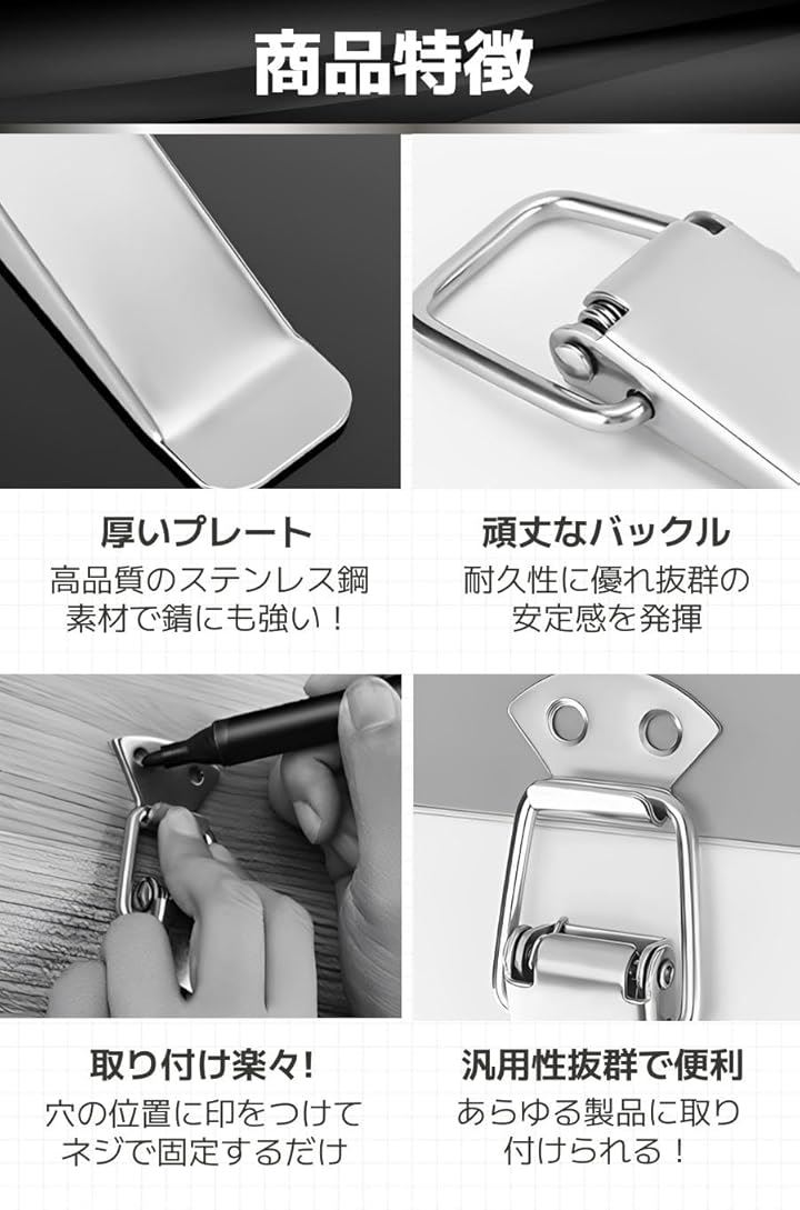 「商品特徴」(1)厚いプレート:高品質のステンレス鋼素材で錆にも強い。/(2)頑丈なバックル:耐久性に優れ抜群の安定感を発揮/(3)取り付け楽々.:穴の位置に印をつけてネジで固定するだけ/(4)汎用性抜群で便利:あらゆる製品に取り付けられる。