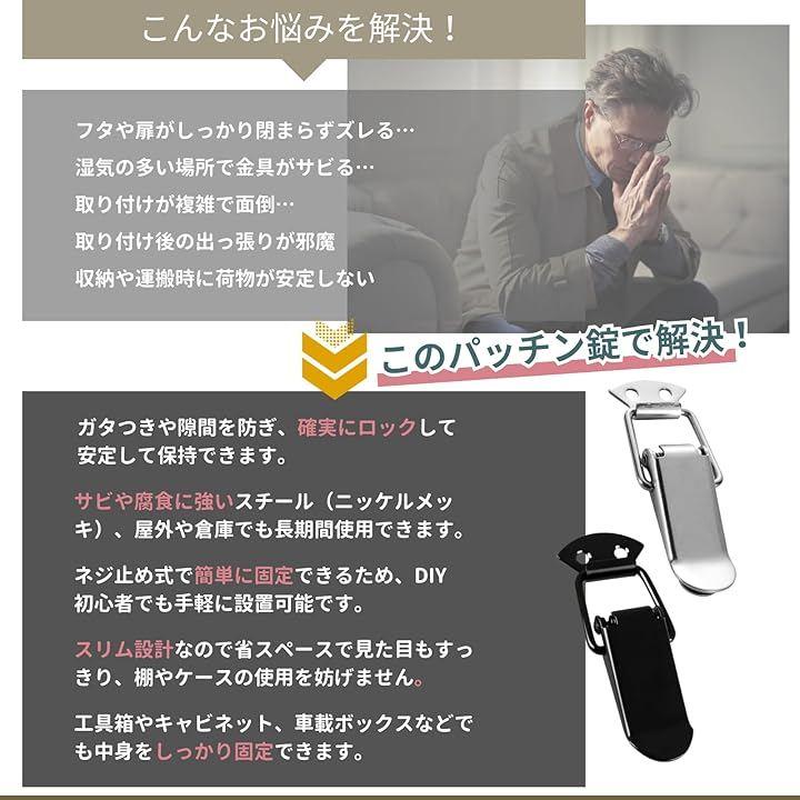 工具箱や木箱、収納ケース、キャビネットなどで開閉をしっかり管理したい場面に最適です。