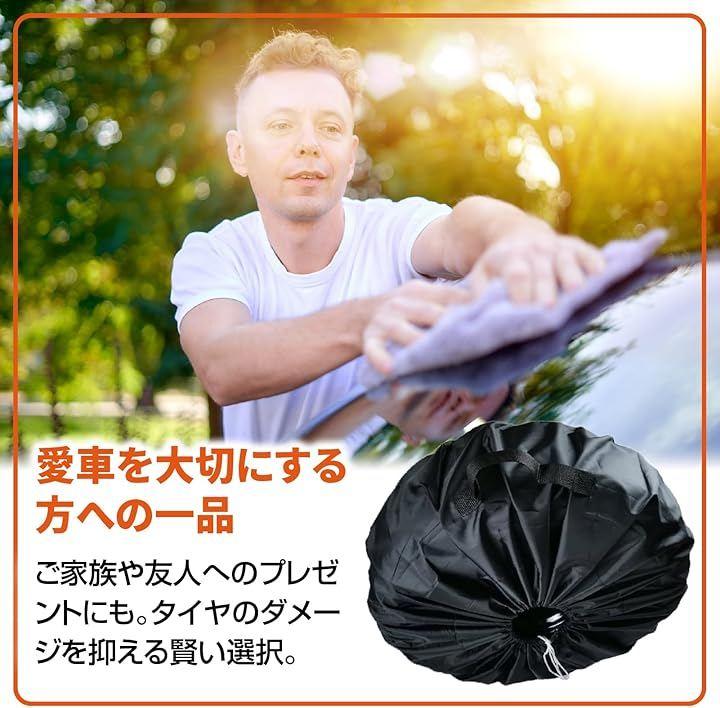 タイヤホイールカバーとしての使い勝手を追求し、紐を引くだけの巾着タイプで工具不要。