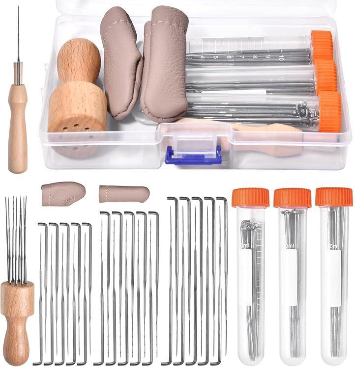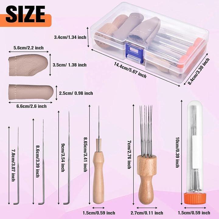 仕様:材質:金属製 「セット内容」細・中・粗突針各10本、単突針 1本、八つ目針 1本、牛革製フィンガーコット 1組、突針収納バケツ 3個、収納箱 1個 。