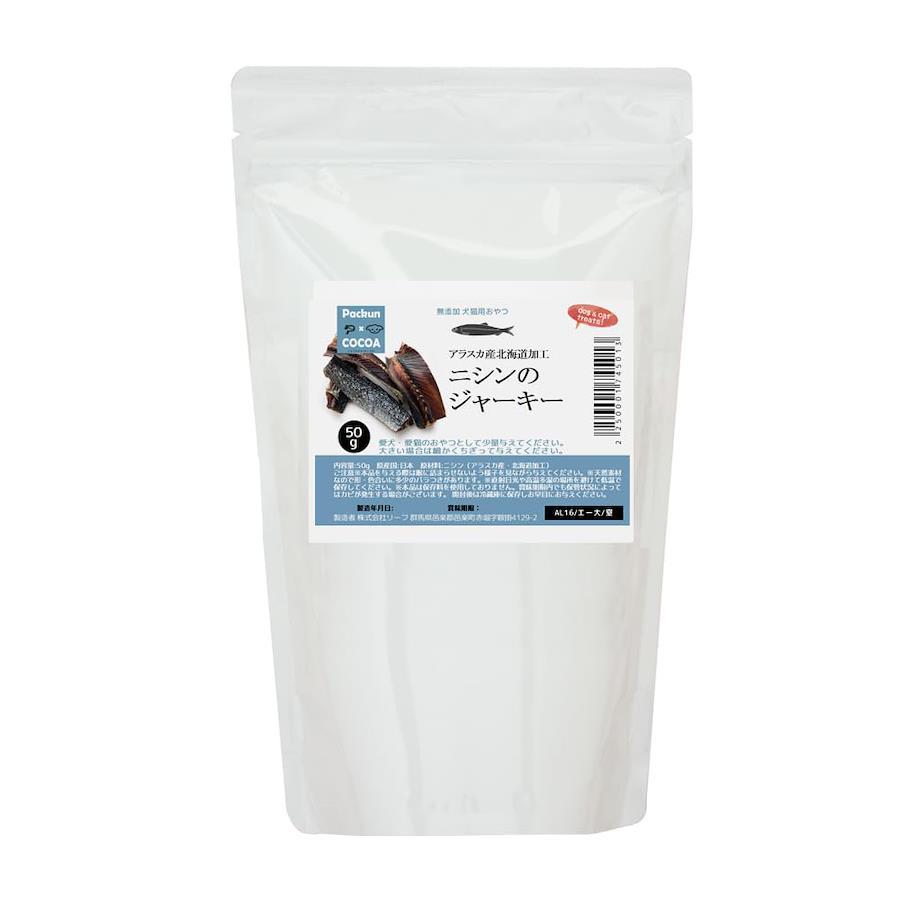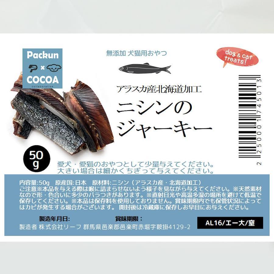 たくさん噛めて大満足!素材そのままのジャーキーが5袋セットになった!ニシンを新鮮なうちにじっくり乾燥させたお魚のジャーキーです。無添加・無着色。無塩、保存料不使用なので安心して与えることができます。硬めのジャーキーなのでしっかり噛んでワンちゃんも満足。猫ちゃんには細かくちぎってお与えください。PackunxCOCOA5袋セットアラスカ産北海道加工ニシンのジャーキー50g×5袋対象犬・猫機能おやつライフステージ生後6ヶ月以上「PackunxCOCOA」コンセプトたくさんの素材をグルメなココアが試食。その中からココアのお気に入りのおやつを厳選しました。ココアお墨付きのおいしさ「PackunxCOCOA」です。特長●新鮮なニシンのお魚ジャーキーです。●ニシンにはカルシウムや鉄分、ドコサヘキサエン酸などのオメガ-3脂肪酸が豊富に含まれています。●無添加・無着色・保存料不使用のニシンを真空パックしております。●味付けはしておりませんので無塩です。素材本来の味をお楽しみください。●保存に便利なチャック付き袋に入っています。●真空パックした小袋を窒素封入したチャック付き袋に詰めてお届け。開封するまで新鮮さがより長持ちします。●5袋セットです。内容量50g×5袋原材料ニシン(アラスカ産・北海道加工)成分総エネルギー:546Kcal/100g、代謝エネルギー:374Kcal/100g粗たん白質:67.40%、粗脂肪:16.53%、粗繊維:0.83%、粗灰分:5.90%、水分:9.34%※ロットにより多少前後する場合があります。製造国日本与え方●愛犬・愛猫のおやつとして少量与えてください。●愛猫には細かくちぎって与えてください。保存方法●直射日光や高温多湿の場所を避けて保存してください。●開封後は必ず封をして冷蔵庫で保存し、賞味期限に関わらず早めにお与えください。ご注意※6ヶ月未満の幼犬・幼猫には与えないでください。※素材の性質・形状から、他の同社商品と比べて真空の度合いはゆるめになっています。※天然素材なので、形・色合いに多少のバラつきがあります。※本品を与える際は、喉に詰まらせないよう様子を見ながら与えてください。※本品は保存料を使用しておりません。消費期限内でも保管状況によっては、カビが発生する場合がございます。開封後はお早目にお与えください。※風通しの良い、直射日光があたらない涼しいところで保管してください。※すぐに召上らない場合は、冷蔵、冷凍で保管してください。※袋の中に水滴がついたら開封し、表面を乾燥させてください。