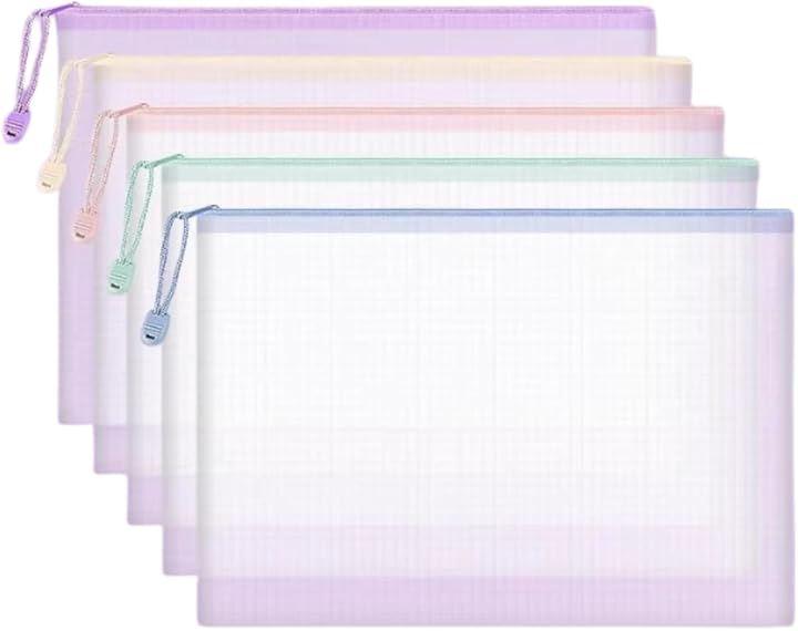 Set of 5 Small Files, Zippered A5 Pouches, Mesh Document Bags for Newspapers, Magazines, Cash, and More. Water-Repellent, Clear Mesh with Zipper Closure. Multi-Size, Semi-Transparent PVC Organizer for Paper Documents, Notes, Coins, Travel Accessories, and Cosmetics.