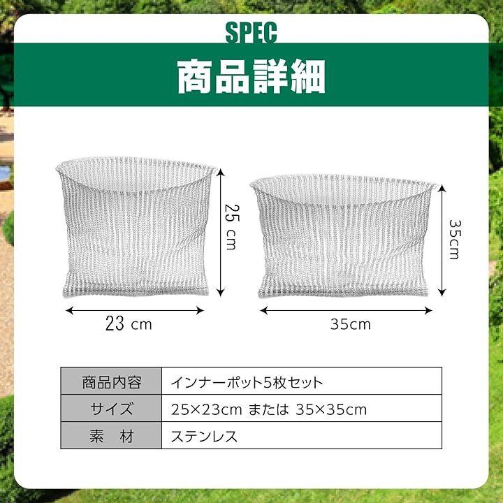 「商品内容」インナーポット5枚セット「サイズ」25x23cm または 35x35cm「素材」ステンレス *モニターの環境により、色の見え方に若干差が生じる場合がございます。