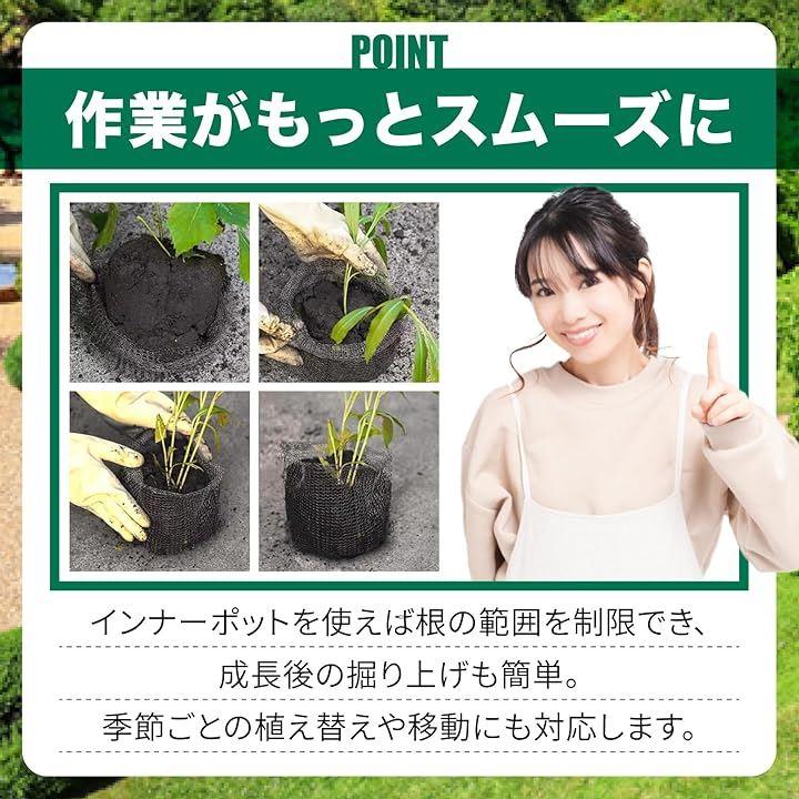 「インナーポットで根の成長をコントロール」通気性・排水性に優れたインナーポットは、植物の根を健やかに育てつつ、広がりすぎを防ぐ効果的なルートバリア。