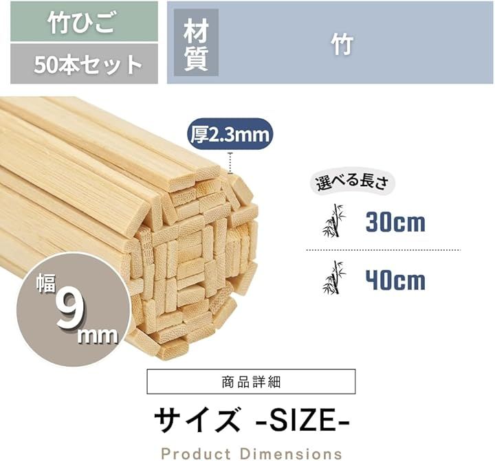 「商品内容」パッケージ内容: 50本セット サイズ(約): 全長30cm (幅9mmx厚2.3mm) 主な材質: 竹 *サイズ詳細は商品画像をご確認ください。