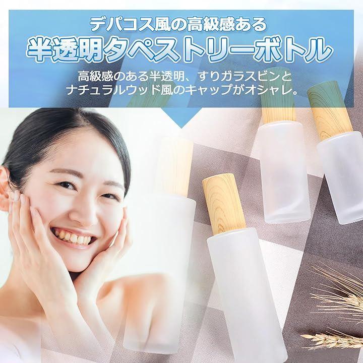高級感のある半透明、すりガラスビンとナチュラルウッド風のキャップがオシャレ。