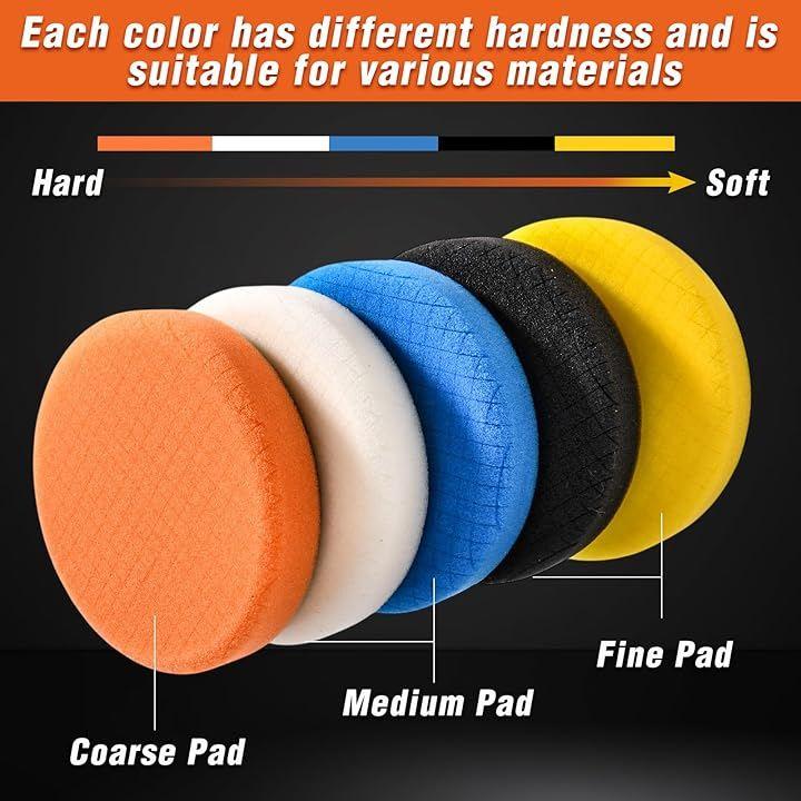パッケージ内容: 黄色、黒、白、青、オレンジの 5 インチ フォーム研磨パッド、ウール パッド 1 個、フェイク ウール パッド 1 個。