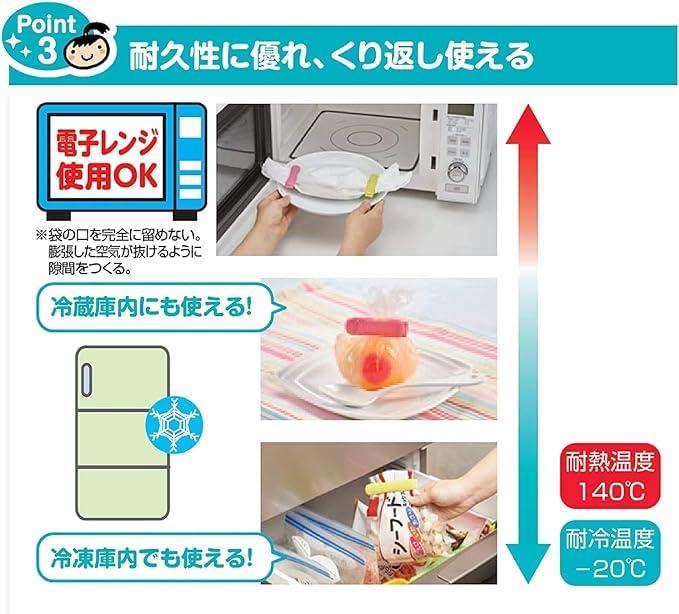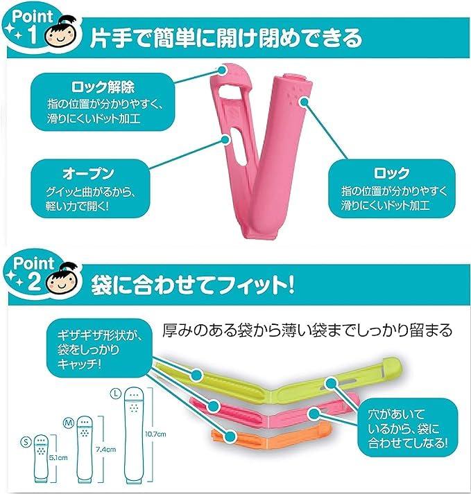 キチントさんパチックは、片手でパチッと簡単に開け閉めできる袋用ワンタッチクリップです。S・M・Lの3サイズで、小さな袋から厚みのある袋まで用途に合わせて便利に使えます。熱に強いので電子レンジでの使用も可能です。