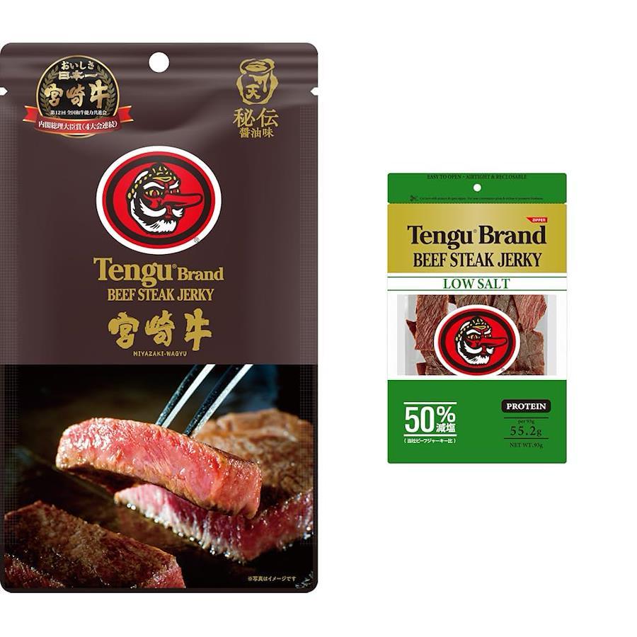 テング ビーフステーキジャーキー レギュラー 50%減塩93g厳選された牛もも肉を使用し、醤油をベースとした味付けのビーフステーキジャーキーです。しっかりとした歯応えが特長で、噛めば噛むほど味わいを感じられる商品です。ビール等のおつまみに最適な商品です。テング ビーフステーキジャーキーの美味しさはそのままに、50%減塩に致しました。