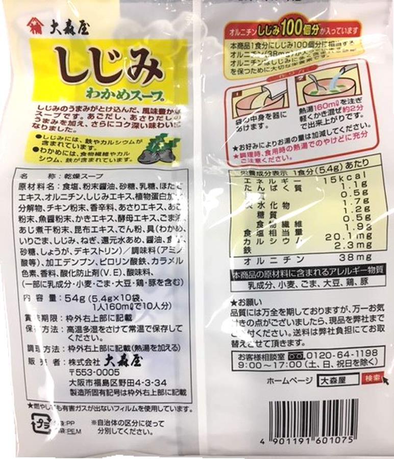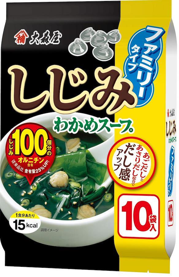 しじみの旨味が溶け込んだ風味豊かなしじみわかめスープです。しじみほたてかきチキン昆布に加え、あごだしあさりだしを新たに配合し、おいしさ溢れる風味豊かな味わいに仕上げました。しじみ100個分のオルニチン含有です。たっぷりお徳用10袋入りのファミリータイプです。原材料:食塩、粉末醤油、砂糖、乳糖、ほたてエキス、オルニチン、しじみエキス、植物蛋白加水分解物、チキン粉末、香辛料、あさりエキス、あご粉末、魚醤粉末、かきエキス、酵母エキス、ごま油、あじ煮干粉末、昆布エキス、でん粉、具(わかめ、いりごま、しじみ、ねぎ、還元水あめ、醤油、食塩、砂糖、しょうが、デキストリン)/調味料(アミノ酸等)、加工デンプン、ピロリン酸鉄、カラメル色素、香料、酸化防止剤(V.E)、酸味料、(一部に乳成分・小麦・ごま・大豆・鶏・豚を含む)高温多湿をさけて常温で保存してください。【重要】メーカーによる商品リニューアルに伴いパッケージ(内容量も含む)変更が行われた場合、新パッケージでお届け致します事ご了承願います。