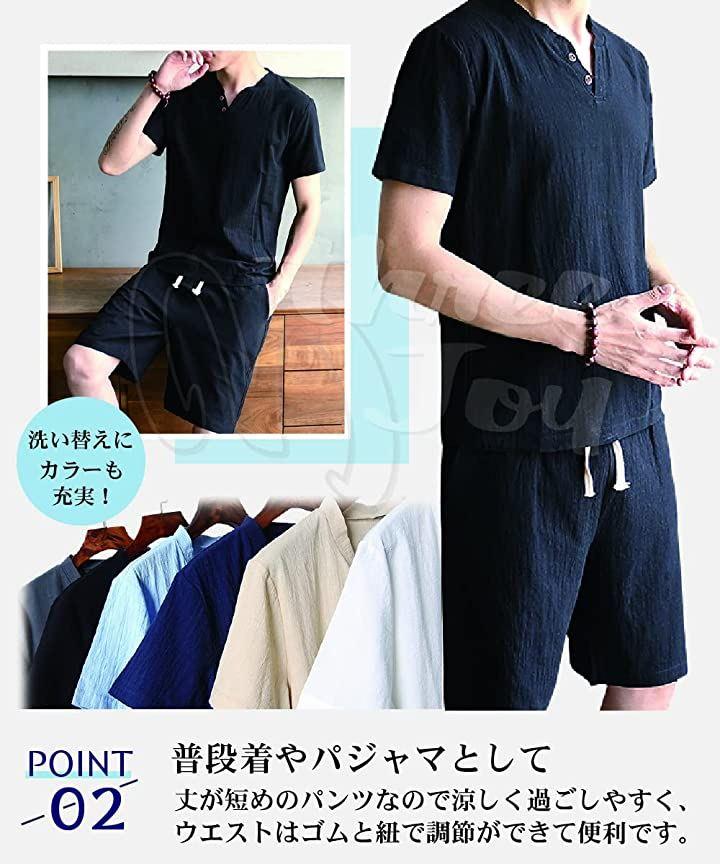 ・「デザイン」部屋着から普段着まで様々なシーンに対応した上下セットアップ。男性の定番のVネック風シャツとトレンドショートパンツのセットで、抜け感のあるデザインなのできっちりしすぎない絶妙バランスがポイント。