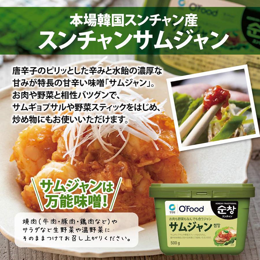 唐辛子のピリッとした辛みと水飴の濃厚な甘みが特長の甘辛い味噌、「サムジャン」。お肉や野菜と相性バツグンで、サムギョプサルや野菜スティックをはじめ、炒め物にもお使いいただける万能味噌です。