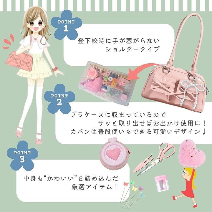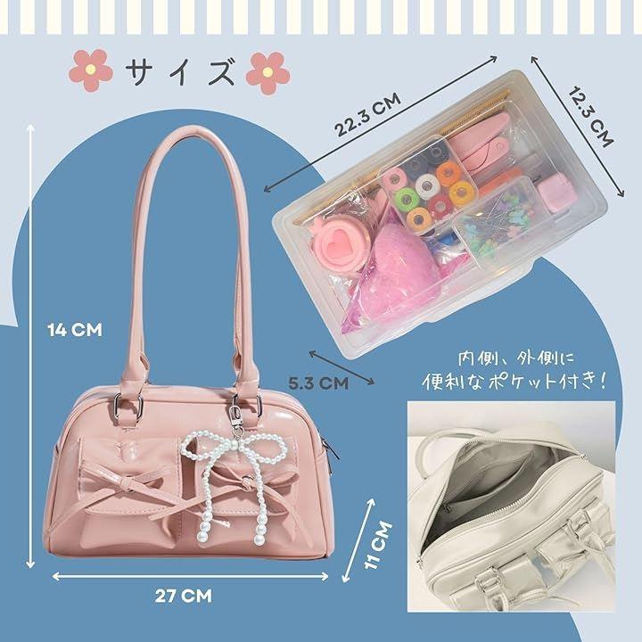 プラケースの中身(22.3cmx12.3cmx5.3cm (1)裁ちばさみ(2)糸切ばさみ(3)手縫い針(4)針山(5)9色糸ボビン(6)まち針蝶々(7)指ぬき(8)リッパーと糸通し(9)メジャー (10)ものさし(11)チャコペン3色(12)折れ針入れ(13)ゴム通し(14)鉛筆削り 可愛いリボンパールチャーム付きショルダーバッグ(ピンク&白) 横幅27cmx高さ14cmx奥行11cm