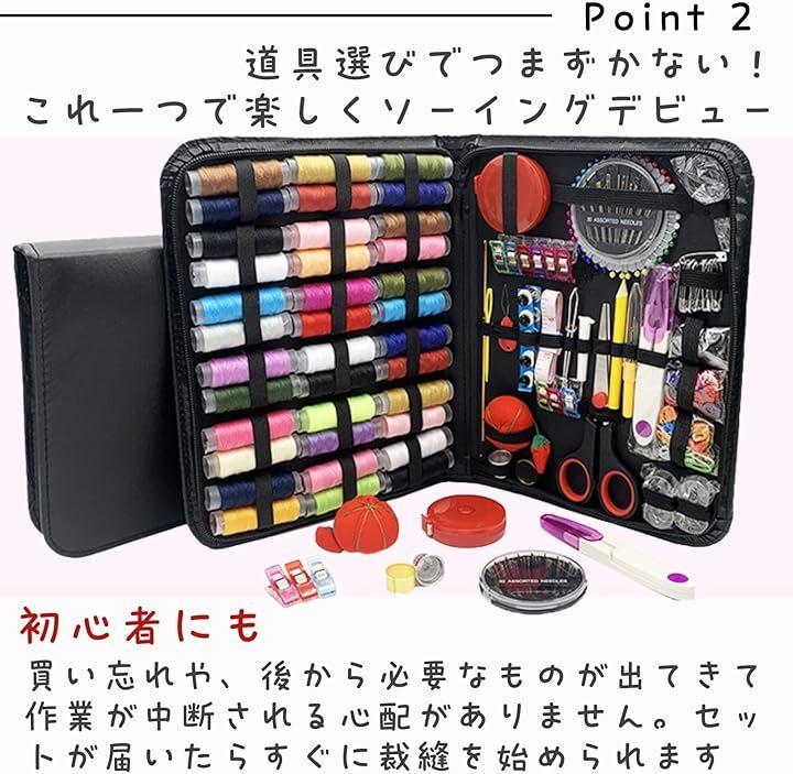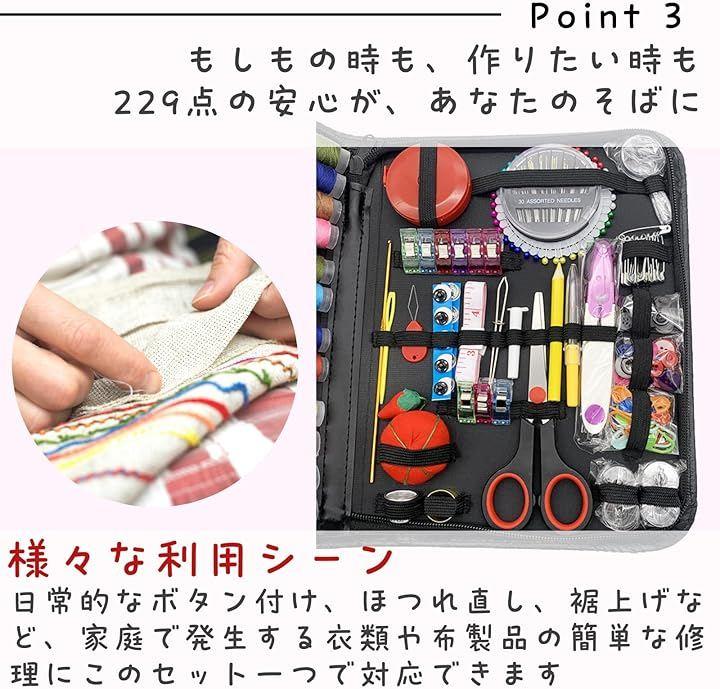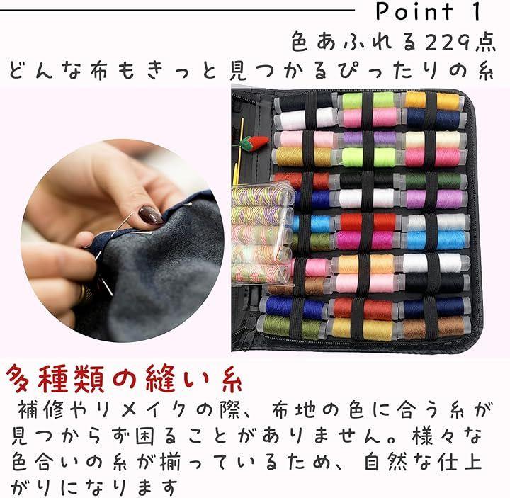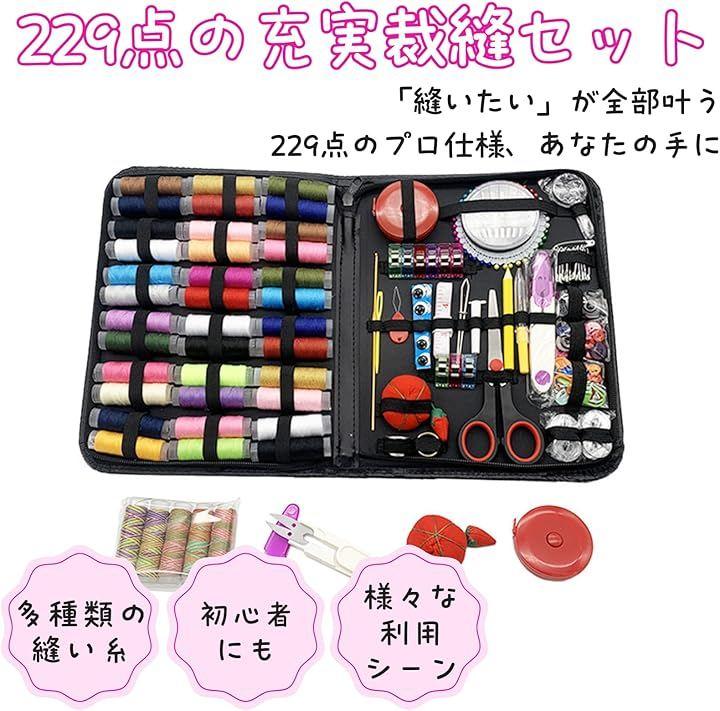 「初心者でも」縫い糸、ぬい針ケース、針山、メジャー、指ぬき、リッパー、拡大鏡、ハサミ、スナップボタン、編み針、糸通し、ボタンなど基本的なさいほう道具(合計229点)が完備しております。