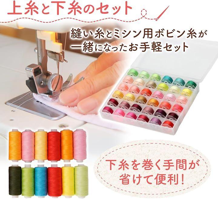 全色収納できる専用ケースと手縫い針12本を同梱し、ボビン高さ11.5 mmでBrother・JUKI・ジャノメなど家庭用ミシンに対応します。