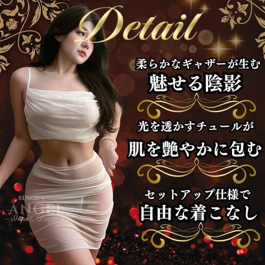 エレガンスとセンシュアルを両立する「シアー×ひだ」のニュアンスたっぷりのボディコン風セットアップランジェリー。 パンティ付きだから、この1セットで「勝負の夜」も即スタイル完成する セクシーランジェリーです。??高級感×色気を引き立てる上質素材 ほんのり透けるシースルー生地と、たっぷり寄せたひだのテクスチャーが大人の艶感を演出。 動くたびに光と影が揺れて、視線を奪います。??細部まで洗練されたデザイン ウエスト切替とバックシームでボディラインを立体的に補正。 ヒップを包むフィットスカートでバックスタイルも抜かりなく パンティもTバック仕様で色気をプラス ??機能性も◎ 伸縮性のあるストレッチ素材で着心地も快適 1枚で着映えするセットアップのボディコン風セクシーランジェリー。??セット内容 ・ドレープトップス ・ドレープスカート ・パンティ(Tバック)【????サイズ展開】 ?? M-Lサイズ相当 ・バスト:80~95cm ・目安体重:45~60kg ?? 2L-3Lサイズ相当 ・バスト:90~108cm ・目安体重:60~85kg 本商品には「XL」のタグが付いておりますが、当社規定のサイズでは「2L~3L」に相当いたします。 ご購入前にサイズ表をご確認くださいませ。 サイズ選びにご不安な点がございましたら、お気軽にご相談ください。(#lf)(#lf)(#lf)商品購入前に、ストア紹介ページをご確認ください。
