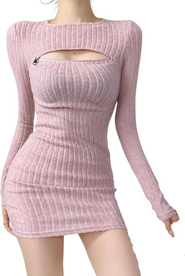 Sexy ribbed knit mini dress, tight zipper, long sleeves, zippered mini dress, mini length, tight dress, long sleeves, women's