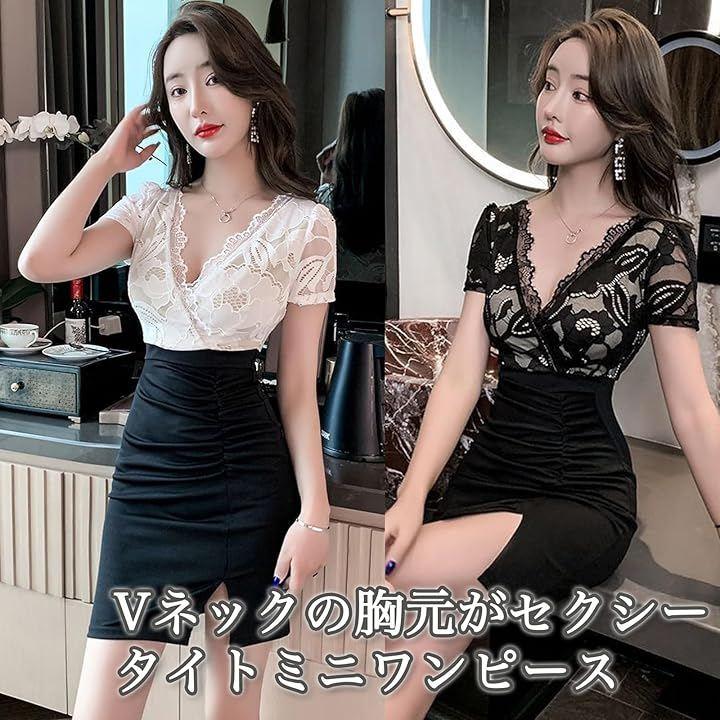 Sexy, tight, lace, floral embroidered mini dress for women, black, knee-length, casual, two-tone, slit, white, docking, V-neck, perfect for office wear, hostess, or bodycon.