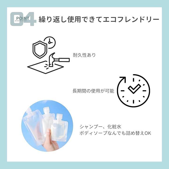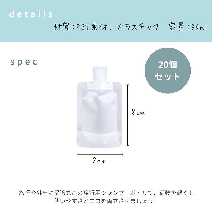 「商品詳細」セット内容:トラベルパウチx20個セット 材質:PET素材 / プラスチック 容量:30ml 旅行や外出に最適なこの旅行用シャンプーボトルで、荷物を軽くし、使いやすさとエコを両立させましょう。