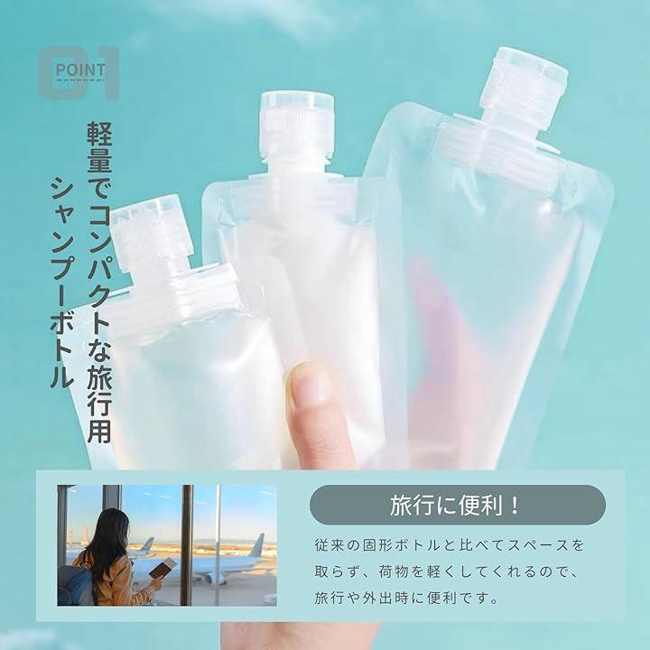「軽量でコンパクトな旅行用シャンプーボトル」このパウチタイプのトラベルボトルは、非常に軽量でコンパクトな設計です。