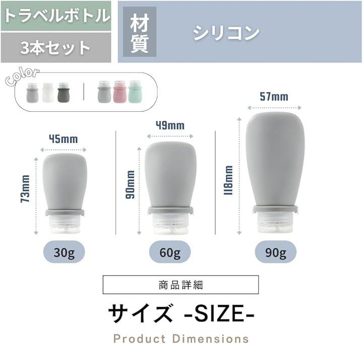 「商品内容」サイズ(約): 30ml(幅45mmx高73mm)、60ml(幅49mmx高90mm)、90ml(幅57mmx高118mm) 主な材質: シリコン *サイズ詳細は商品画像をご確認ください。