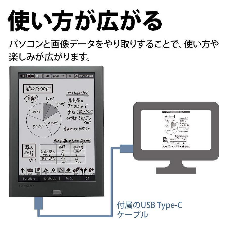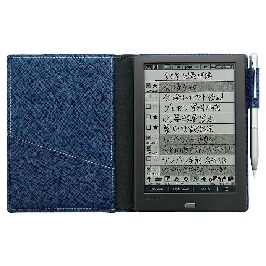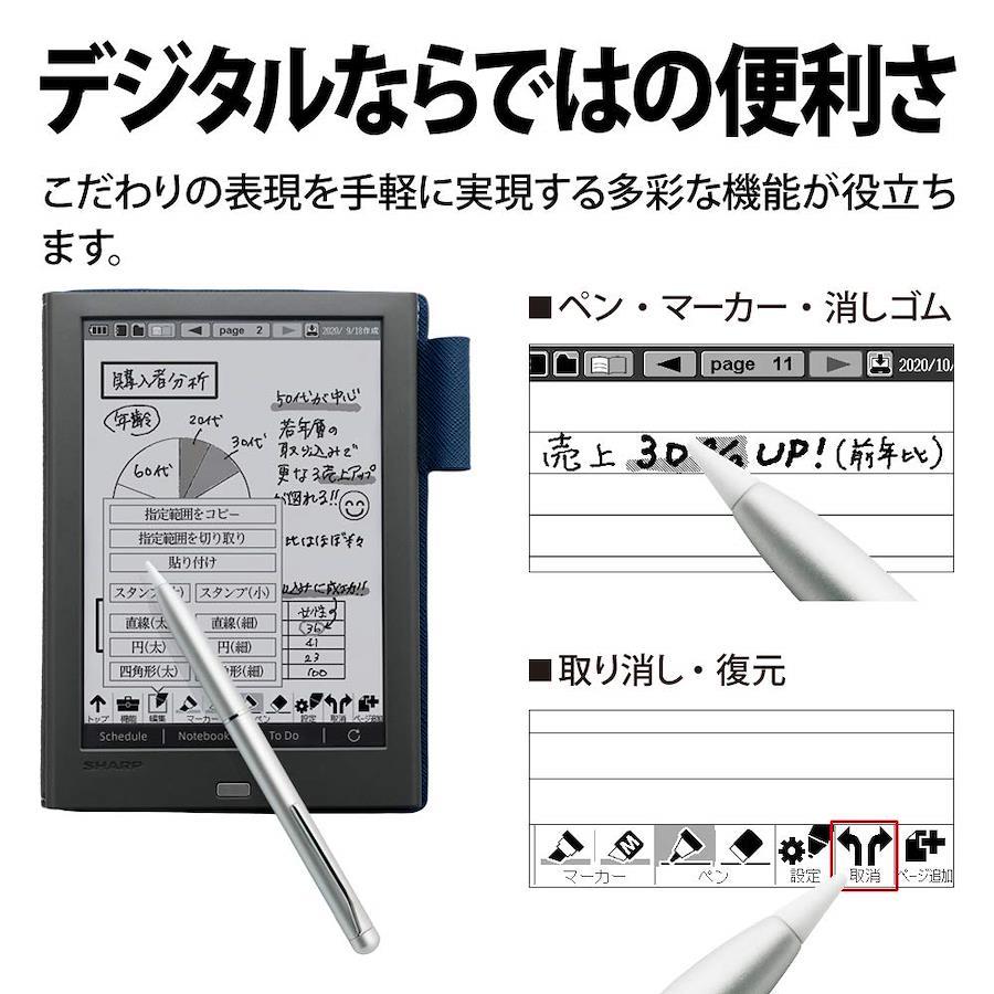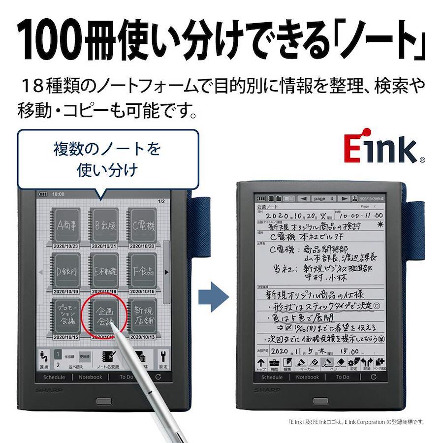 :シャープ 電子ノート 電子メモ WG-PN1 手帳機能付き Eink 電子ペーパーディスプレイ搭載ブランド シャープ(SHARP)接続技術 USB Type-C画面サイズ 15.24 センチメートル付属品 専用カバー(着脱式)、スタイラスペン、USB Type-Cケーブル色 ブラック、ブルー、グレー商品寸法 (長さx幅x高さ) 15.7 x 11.4 x 1 cm スケジュール最大合計1,000ページ、最大9冊ノート 最大合計5,000ページ、最大100冊To Do 最大合計1,000ページ、最大100冊画面サイズ6型、電子ペーパーディスプレイ搭載紙のように見やすい電子ペーパーディスプレイ採用。ノート、スケジュール機能に加えビジネスに不可欠なToDo機能を新たに搭載。
