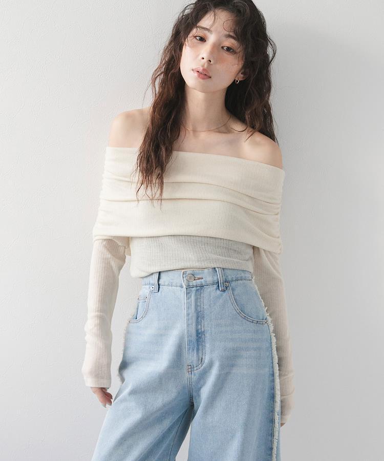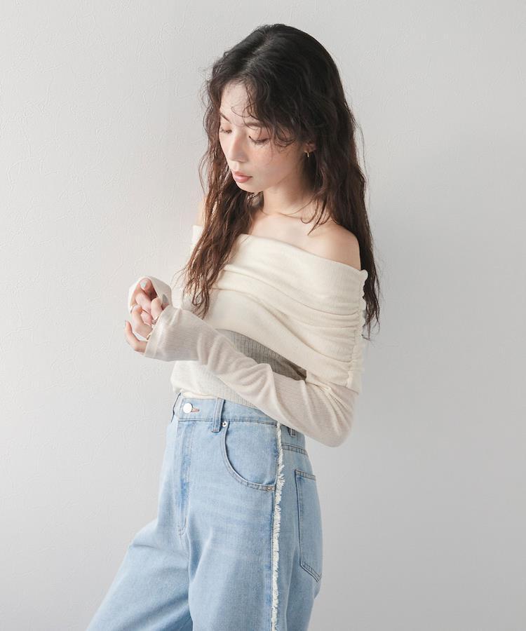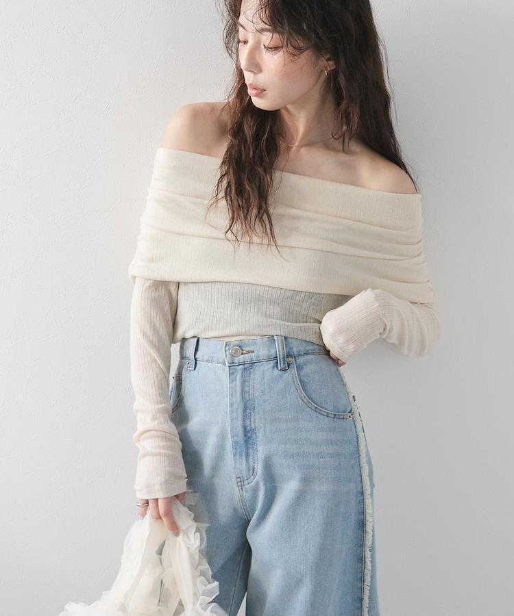 ほんのり透けるシアー感が可愛い!リブ素材のシアーギャザーオフショルトップス