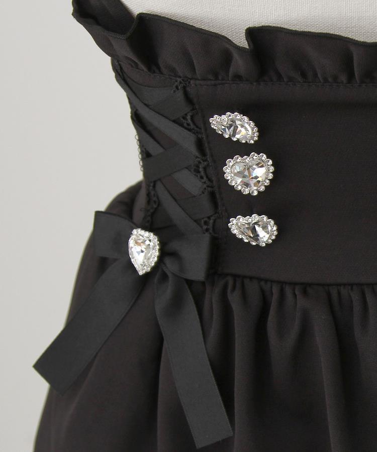 ハイウエストデザインがかわいいレースアップとハートビジューたっぷりのサス付きスカート。