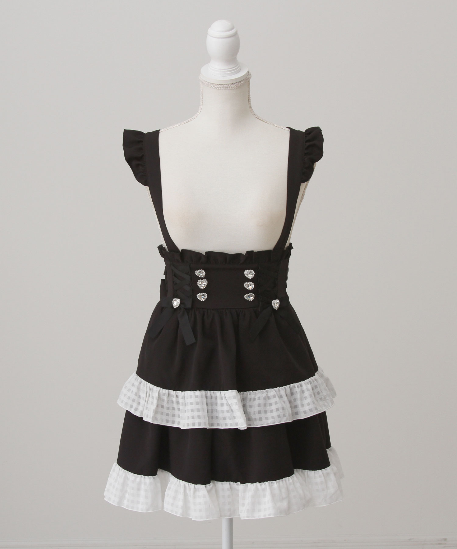 ハイウエストデザインがかわいいレースアップとハートビジューたっぷりのサス付きスカート。