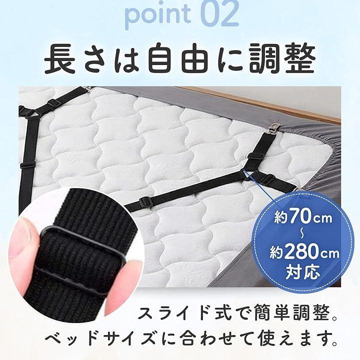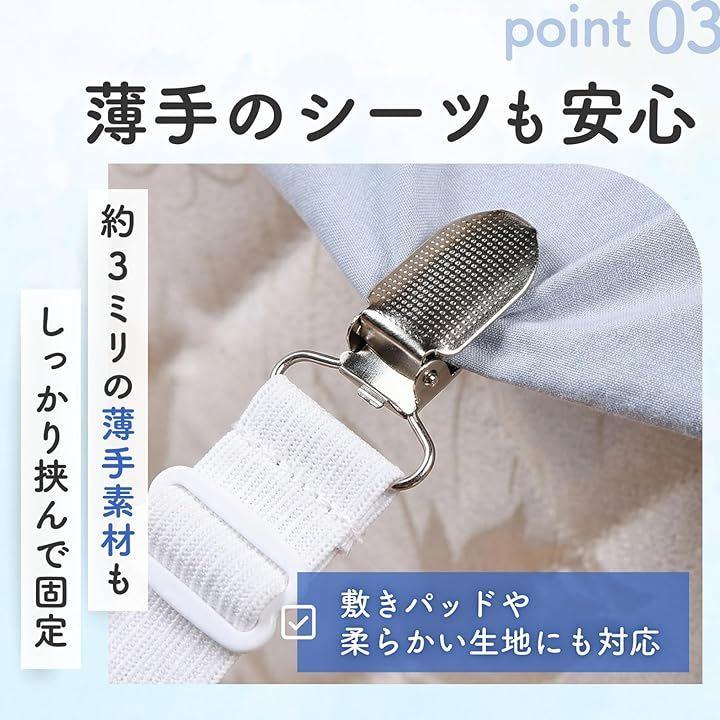 「薄手素材でも安心」3mm程度の薄いシーツや敷きパッドでもしっかり挟み込み、固定できるよう設計されています。