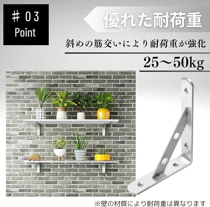 耐荷重は50kgと高耐荷重設計で、キッチンやガレージ、リビングなどの収納スペースを頑丈にサポートするブラケットです。