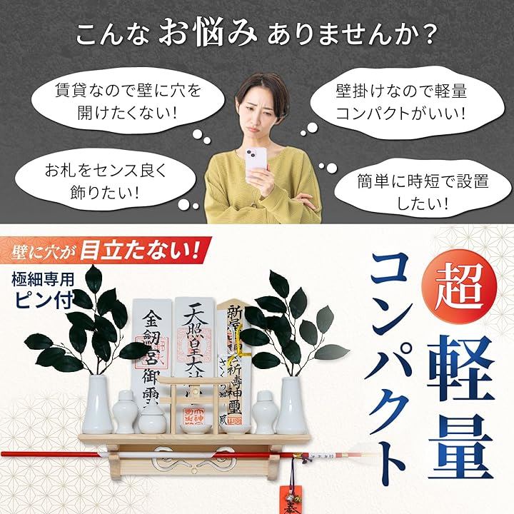 神社やお寺から授与された御札や御守、破魔矢などの保管場所って・・なかなか良い所がありませんよね。?そんな多くのお悩みの声から誕生した「さくら禅」ブランドの壁掛けできる棚型モダン神棚です。