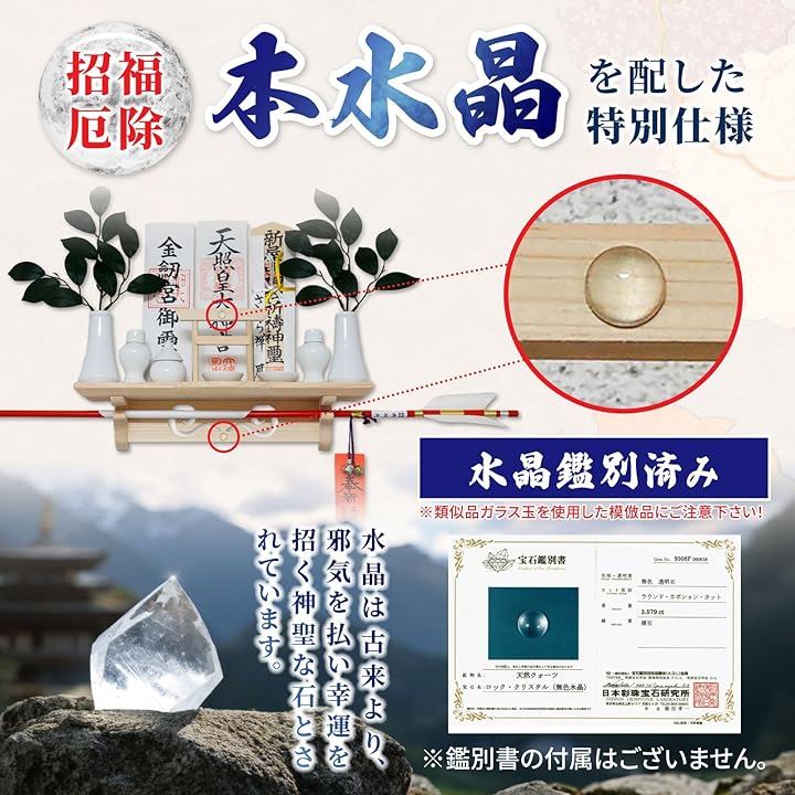 「*御札・神具一式・破魔矢は別売で付属はございません」鳥居の差込み穴は鳥居を抜けづらくする為に少しづらして設計されておりますので、鳥居を差し込む時は鳥居の足部分を軽く握り、穴に合わせ、はめ込むようにして取付けて下さい。