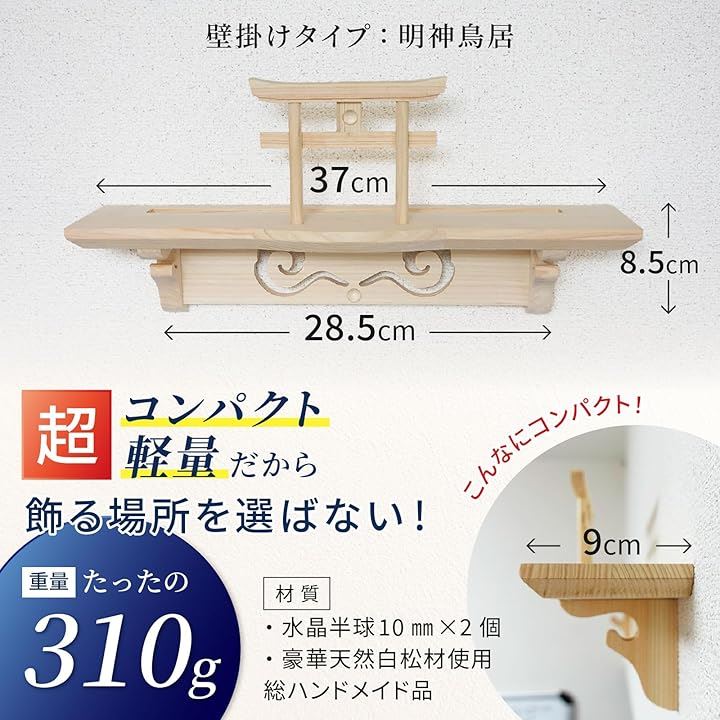「スペック」素材:天然白松造り サイズ:(約)本体のみ(鳥居取付けなしの状態):縦8.5cmx横37cmx奥行9cm 310g