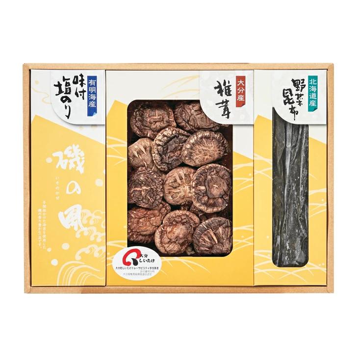 大分産原木乾椎茸こうしん30g、北海道産野菜昆布40g、有明海産味付塩のり(3切9枚)×各1