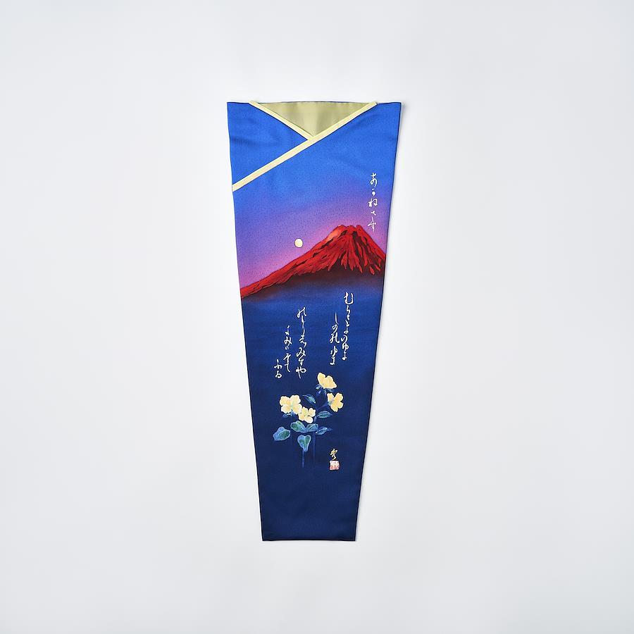 意匠は本作のために木下秀硯氏が手描きで制作した一点ものです。描かれているのは赤富士、日本を象徴する霊峰富士の姿を題材とした意匠です。夜明けの光に染まる富士の情景とともに、和歌が添えられています。 古くから伝わる和歌の情景とともに、日本の自然と文化の趣を感じられる作品です。