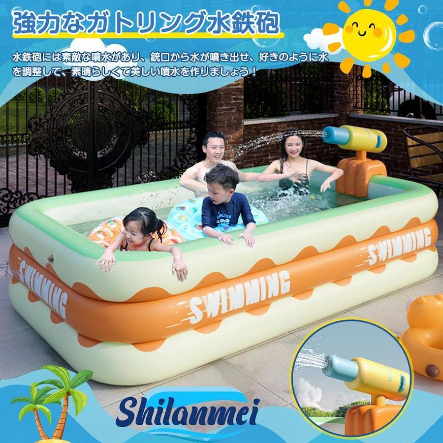 【超大サイズのファミリープール】夏の暑い時期に家でも楽しく遊べる大型ビニールプールを開発しました!幅380cmとビッグサイズなので、子供たちが泳いだり練習したり、大人が体を伸ばしてリラックスしたりできます。夏らしいカラフルなカラーは、子供も大はしゃぎ間違いなし!今年の夏は家族、友達と一緒に素敵な思い出を作りましょう! 【滑り台&バスケット付きの噴水プール】滑り台付きでワクワク感倍増!滑り台は取り外し可能なセパレートタイプで、プールと滑り台単体でも遊べるようになっています。すべり台の他にバスケットがついています。水を噴くおもちゃも含まれているので、飽きずに楽しく遊ぶ事ができます。(必要に応じてコースを選ぶ) 【電動ポンプ付き・設置しやすい】ビニールプールには高性能電動エアポンプが装備されています。サイズはとてもコンパクトで、収納や持ち運びがとても便利です。ワンボタンスタートので、空気入れと空気抜きをする時、子供でも簡単に操作できます。70度高温に耐えられるファミリープールです。高温の中でも変形しません。 【赤ちゃんにも安全な素材】Shilanmeiプールは人体に無害、且つ靱性の持つPVC素材を使い、破れや裂けに強く、水漏れや空気漏れを防ぎ、安全感があります。厚地でお子様が腰掛けられるよう厚めに壁が作られており非常に丈夫に作られています。折りたたむとコンパクトで、持ち運び便利です。 【空気・水抜きが簡単】排水栓がついているビニールプールは、底の栓を開くだけで水を抜くことができます。空気を抜く時もカンタンです、栓を開けると自動で空気が抜け、片付けがとても楽です。※エアープールのボディは空気の漏れが発生する場合、ご連絡して頂ければ、すぐにご対応致します。