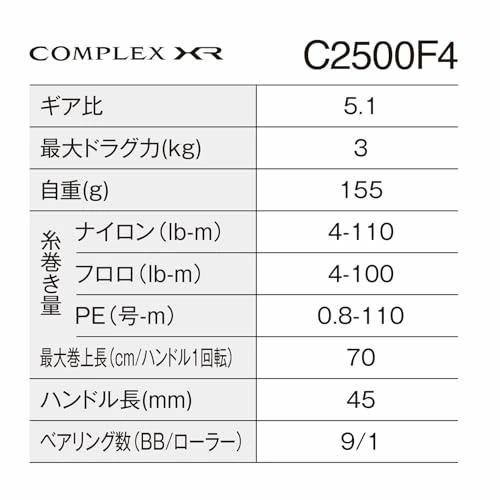 糸巻量:ナイロン(lb-m) 4-110、5-90、6-70 / フロロ(lb-m) 3-130、4-100、5-80 / PE(号-m) 0.6-180、0.8-110、1-90