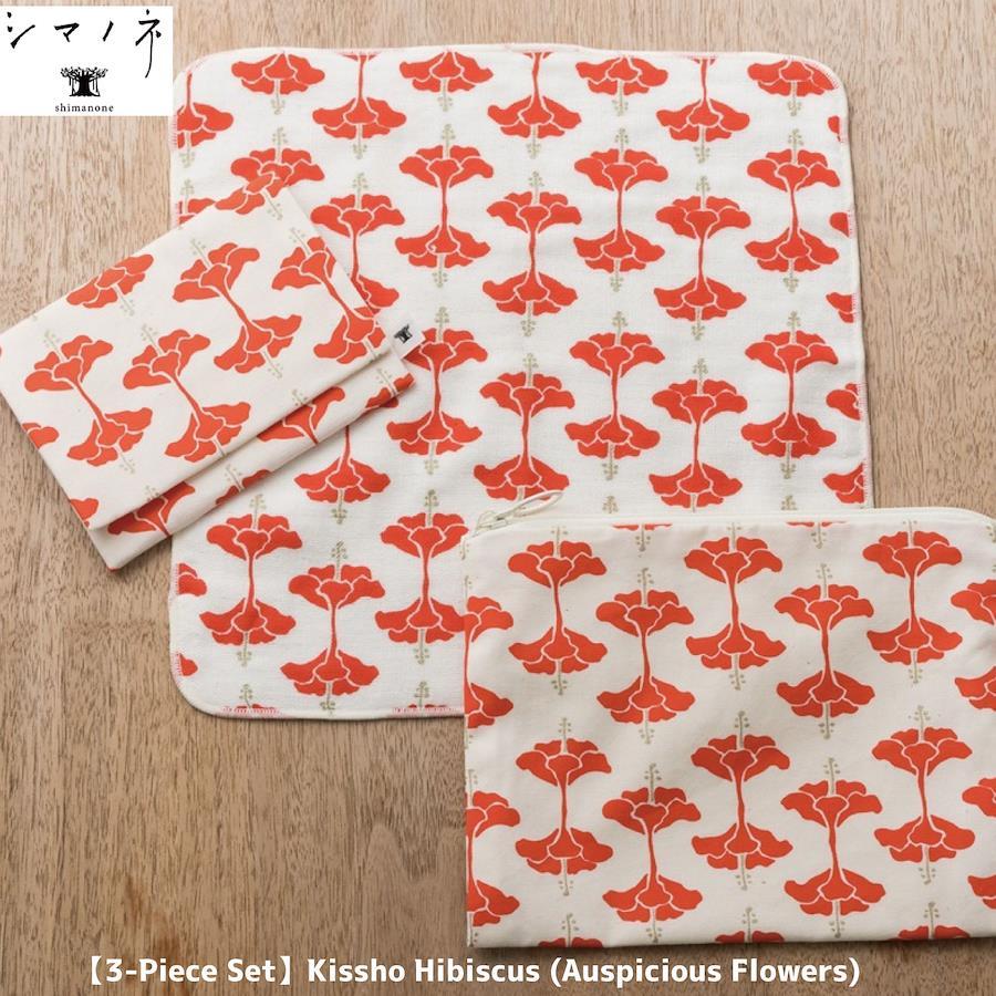 Shimano 3-Piece Set: Pocket Tissue Case, Flat Pouch, and Towel Handkerchief with Auspicious Hibiscus Pattern