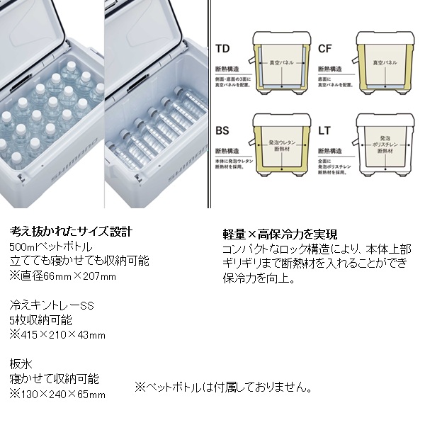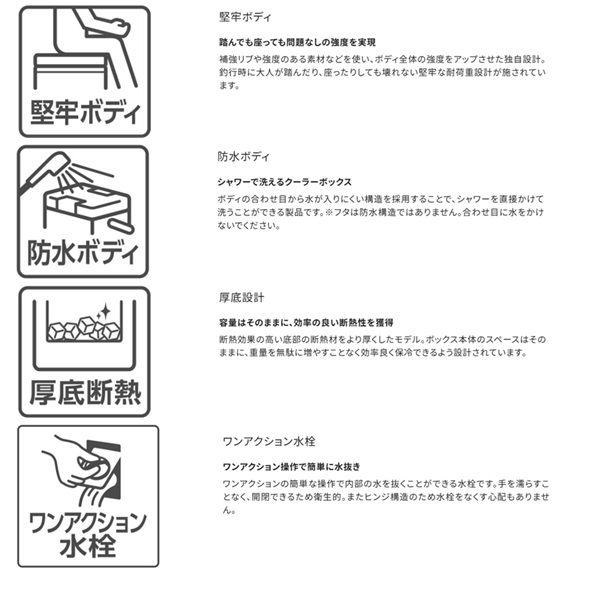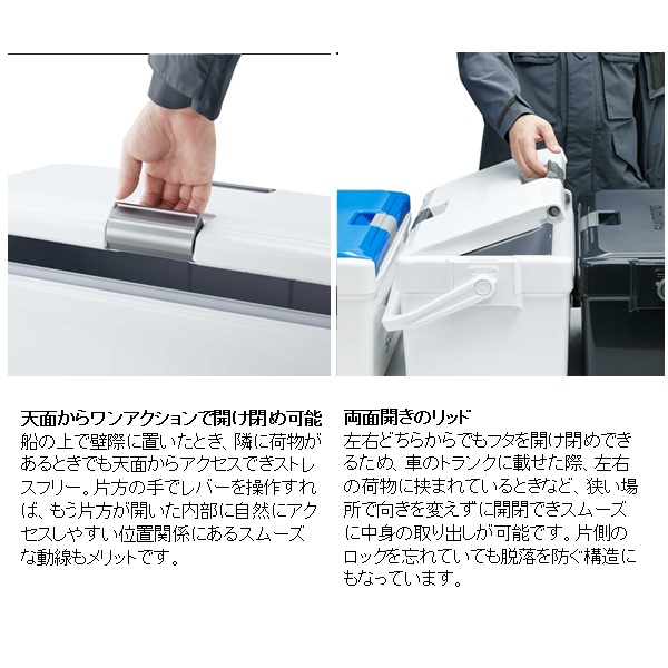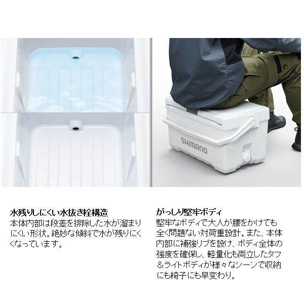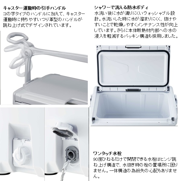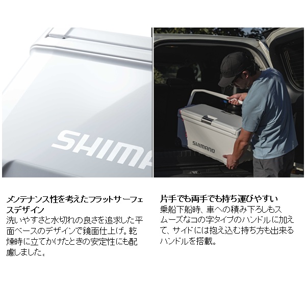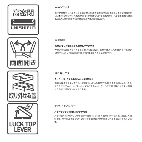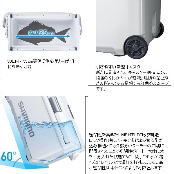 移動も収納も、釣行の「気が利く」相棒。魚を持ち帰ることを考えた新定番の釣り用クーラーボックスです。20Lは内寸45cmを確保、グッドサイズの魚を折り曲げずに持ち帰ることができます。30Lは内寸55cmを確保し、尺超えの魚も折り曲げずにそのまま収納でき、キャスター付きで移動もスムーズ。独自構造「UNISHIELD」により密閉性が高く、水漏れや冷気漏れを抑えやすくなっています。両面開きの蓋は、車内や船上の限られたスペースでも開閉しやすく、ワンタッチで開く跳ね上げ式水栓は使用後の水抜きも快適。底部に水が残りにくく、洗いやすさにも配慮されています。堤防釣りからインショアボート、船エサ釣りまで幅広く対応する、頼れるクーラーボックスです。 容量(L):30 重量(kg):6.2 COOL:105 断熱構造:1面底真空パネル+発泡ウレタン 内寸法 - 中央値(cm):23.0 x 55.0 x 23.9 内寸法 - 底部(cm):22.0 x 53.9 x 23.9 外寸法(cm):36.6 x 72.5 x 33.2 ※:クーラーの寸法は目安です。※外寸法にはハンドルを含みます。※底部の長さは、底面の角Rの中心と中心を結んだ長さです。※各シリーズの収納例は、板氷:130×240×65mm、保冷剤XL:195×255×35mm、オキアミ:170×300×60mm、飲物:PETボトル500ml Φ66×207mm、PETボトル2l 90×105×305mm、PETボトル1l 75×95×205mmを想定しています。※上蓋の断熱材は全て発泡ポリスチレンです。※クーラーの蓋の裏にある小さな穴は、内部の圧力を調整するための通気孔です。ご安心してお使いください。※蓋は防水構造ではありません。合わせ目に水をかけないでください。※水栓のナットが内側に部分的に突出しているところがあります。 ※実物と色が違って見える場合があります。あらかじめご了承下さい。