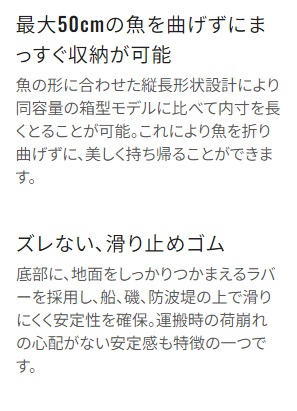 船、磯、防波堤と守備範囲の広いオールラウンダー。 3面・一体型真空パネルで、魚の鮮度を長時間キープ。良型の真鯛やヒラメ、大型グレや黒鯛など最大50cmの魚を曲げずにまっすぐ収納が可能。底面と側面に一体成型の真空パネルを配置することでI-CE値55hをマーク。座って踏まれても壊れにくいタフで軽量なボディをシマノ独自の設計で可能にしました。 カラー:リミテッドホワイト 容量:25L 外寸:657×305×320mm 内寸:492×212×230mm 重量:6.1kg 素材: PP、ステンレス ※実物と色が違って見える場合があります。あらかじめご了承下さい。